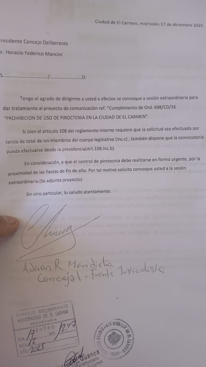 El Concejal de la ciudad de El Carmen, Adrián Mendieta, solicitó al Concejo Deliberante la convocatoria a una sesión extraordinaria para tratar un tema de suma importancia para la comunidad: la reactivación y efectiva aplicación de la Ordenanza Municipal N.º 698/16 y de la Ley Provincial N.º 6187, que prohíben la venta y el uso de pirotecnia sonora en todo el territorio jujeño.