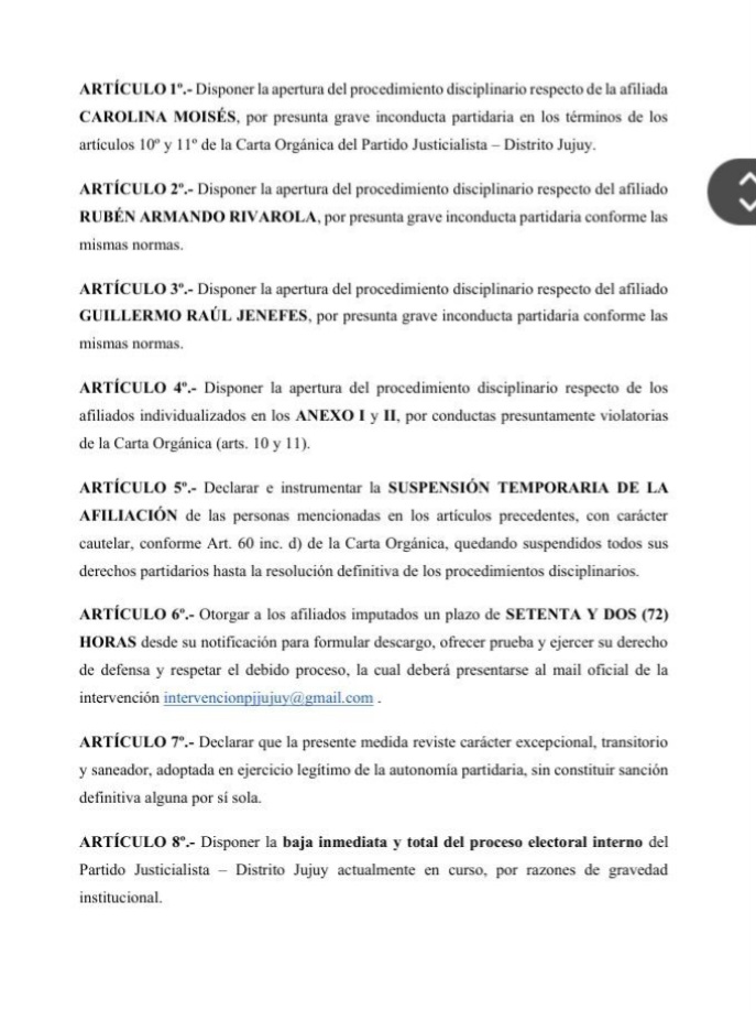 La decisión fue tomada por los interventores del Partido Justicialista, Aníbal Fernández y Gustavo Menéndez, determinando suspender la afiliación de los dirigentes Carolina Moisés, Rubén Armando Rivarola y Guillermo Jenefes, convocando además a elecciones internas para el mes de abril.